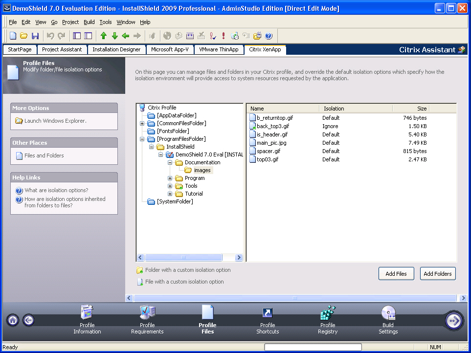 On the Profile Files page, you can use the Add Files and Add Folders buttons to add new files and folders to include in the Citrix profile. See Adding, Deleting, and Moving Files and Folders in an App-V Package.