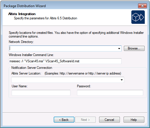 Network DirectorySpecify or browse to the network location where you want to store the installation package. The Distribution Wizard remembers the last Network Location that is entered and displays it the next time this panel is accessed. The Distribution Wizard will copy the Windows Installer package along with any transforms and files to the UNC path specified. Also, the Distribution Wizard will use an XML template file (AltirisTemplate.config) to create a custom script file in this location named <packageName>.Config. You can edit AltirisTemplate.config to customize it for your organization. The file, which is installed with AdminStudio, is located in the Templates folder of the AdminStudio Shared directory. See Altiris XML Template for more information.