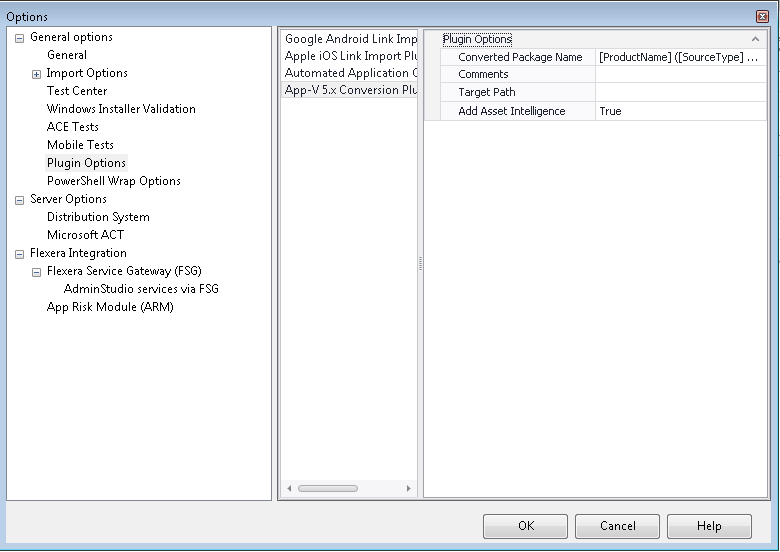 On the Plugin Options tab of the Application Manager Options dialog box, you can specify options for AdminStudio plug-ins including the import of Google Android and Apple iOS public store apps, Automated Application Converter, App-V 5 conversion, and Microsoft Intune conversion. The Plugin Options tab includes the following subtabs: