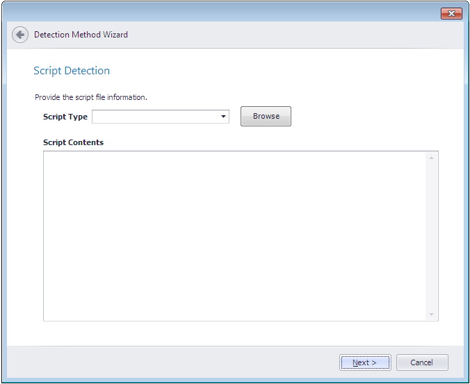 | Script Type | First, select one of the following options: PowerShell,VBScript, orJScript. Next, click theBrowsebutton and select the script that you want to use for this detection method. You also have the option of entering or pasting the script code directly into theScript Contentsbox. |