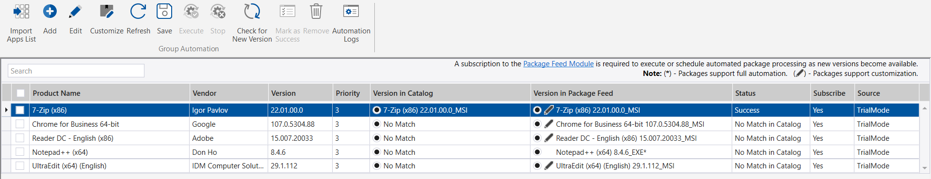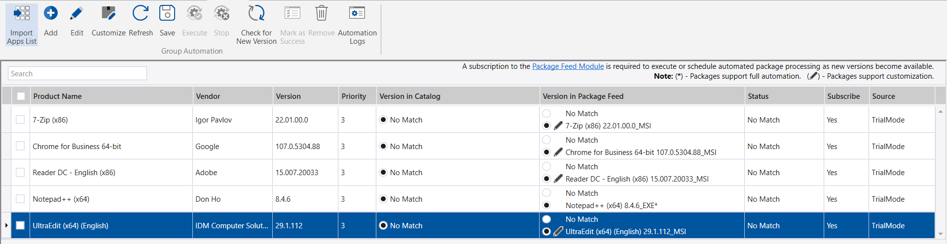 • All the Package Feed Module trial packages are by default subscribed for automation by setting the Subscribe column to Yes . If you wish to change, set the Subscribe column to No .