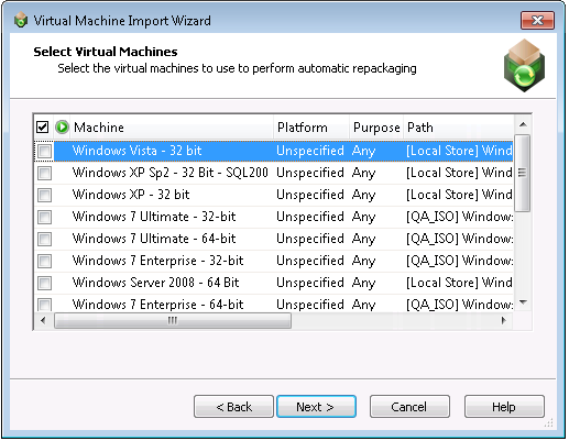PlatformIdentifies the operating system platform of the virtual machine. When you select a virtual machine to add to the Automated Application Converter, you need to manually identify the operating system platform either on the Select Virtual Machines panel or by clicking in this field on the Machines tab and making a selection from the list. When you perform a conversion run, you are given the opportunity (on the Automated Repackaging on Virtual Machines panel) to either select a specific platform to use for the repackaging of the selected packages, or to select Any Platform , meaning that all of the selected virtual machines will be used for repackaging.