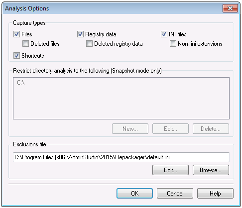 The Analysis Options dialog box, accessible by clicking Edit from the Set Target Project Information and Capture Settings Panel or the InstallScript MSI Conversion Output Panel , allows you to specify capture types for the repackaging session. You can also edit or change the exclusions file that will be used for this repackaging session.