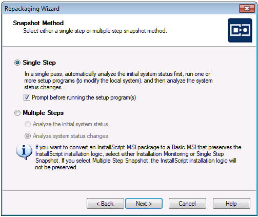 | Single Step | Repackaging in a single step requires you specify at least one setup program to repackage. The Repackager first takes an initial system snapshot, then runs the setup program(s) you specify, and then takes a second snapshot to create the script file that can be converted into a Windows Installer package. You also have the option of requiring the Repackager to prompt you before running the setup program(s), allowing you the opportunity to make changes to your system that you want included in the final package. |