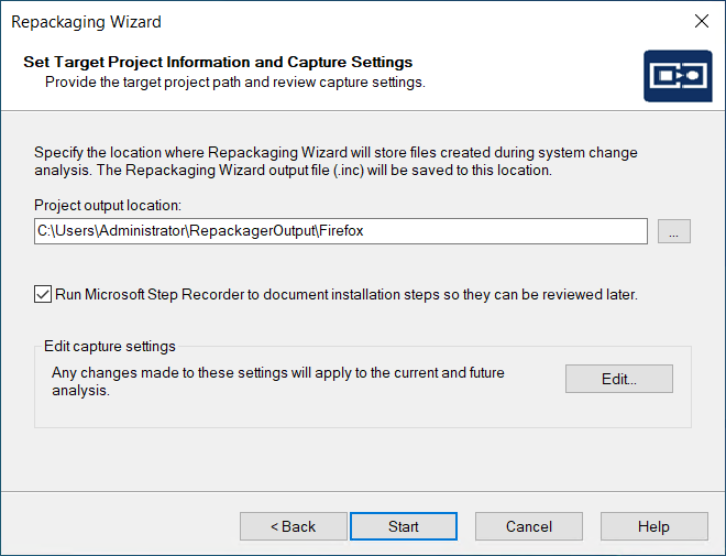 You can use the Microsoft Steps Recorder documentation tool with the Repackaging Wizard to automatically record the step-by-step actions that occur during repackaging. This information, which is saved in a web archive (.mht) file, includes a text description of where you clicked on each screen, along with a screen capture for each click. To enable this option, select the Run Microsoft Step Recorder to document installation steps so they can be reviewed later option. For more information, see Documenting Repackaging Steps Using the Microsoft Step Recorder Tool.