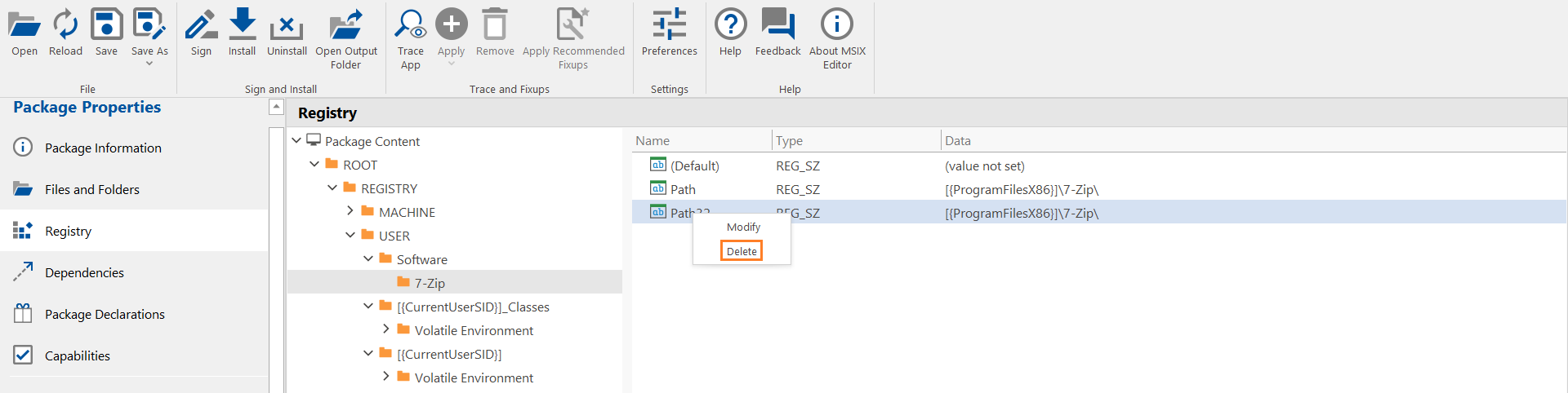 2. In the Registry pane, right-click the registry key or registry value that you want to delete, and then click Delete . ![](/images/MSIX EDitor_Registry_AddNewRegistry4.png)